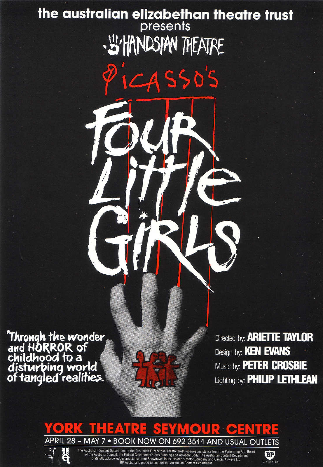 Blending dance and puppetry, Four Little Girls looked at life and death from a child's point of view. It was based on Pablo Picasso's 1948 text, "Playscript 32", adapted and directed by choreographer Ariette Taylor.