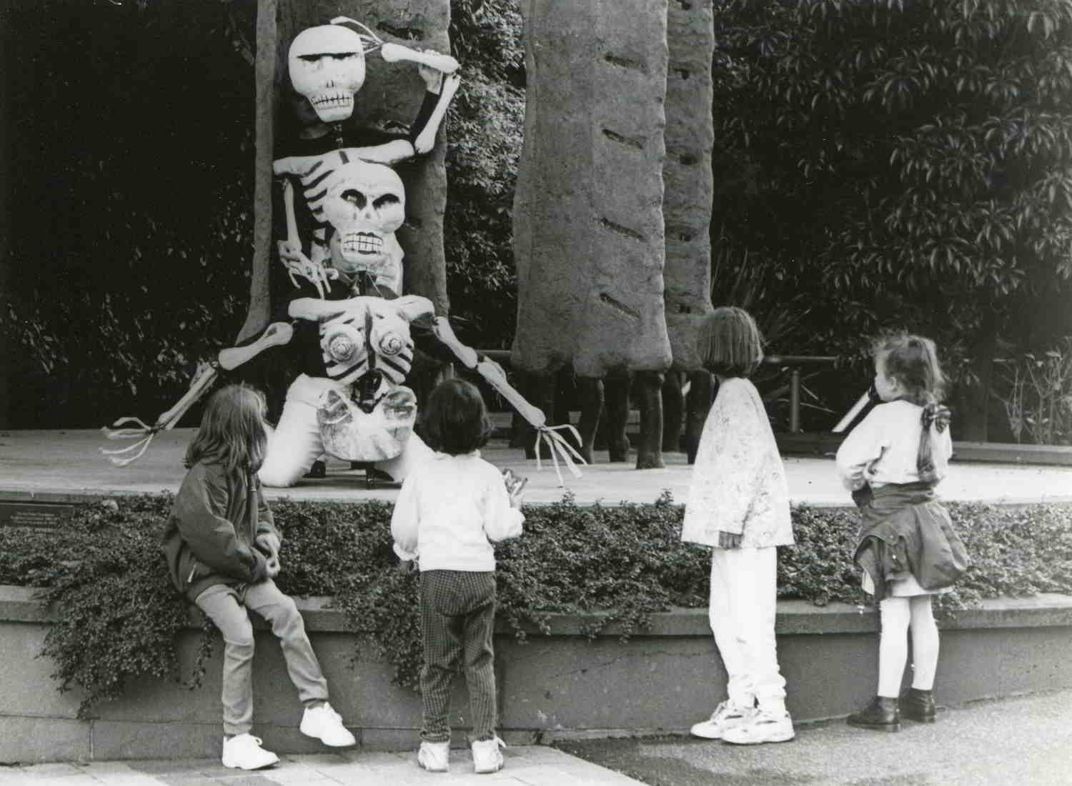 Designed and devised by Ken Evans and Rod Primrose for spot appearances in the Arts Centre precinct throughout the Festival's opening celebrations, the piece included 5 large skeletons worn as body puppets who manipulated 2 smaller skeletons in spot performances.