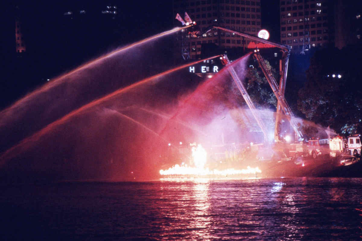 Each night, the barge stage was towed upriver to the Princes Bridge/Southgate basin in the centre of Melbourne where the audience could view the half hour performance from the riverbanks.