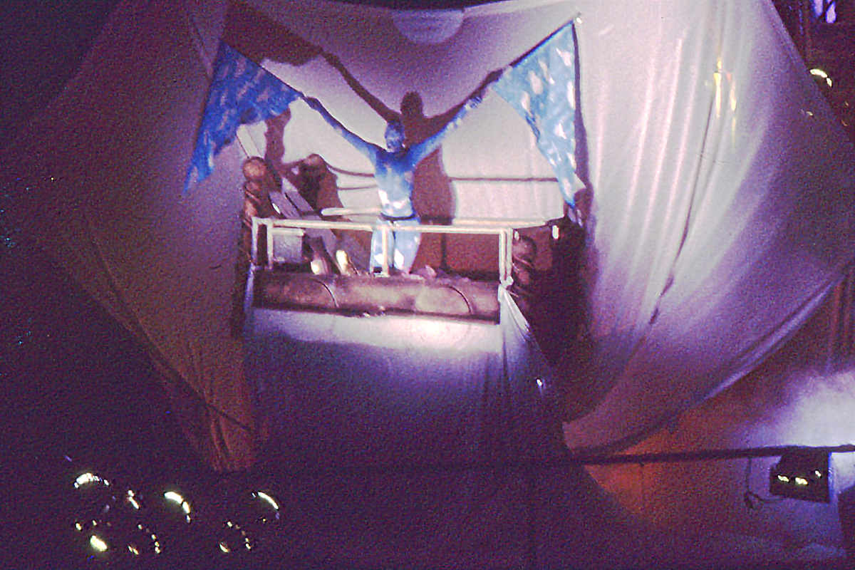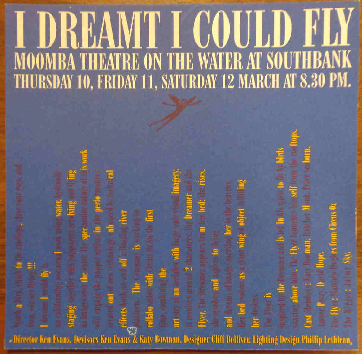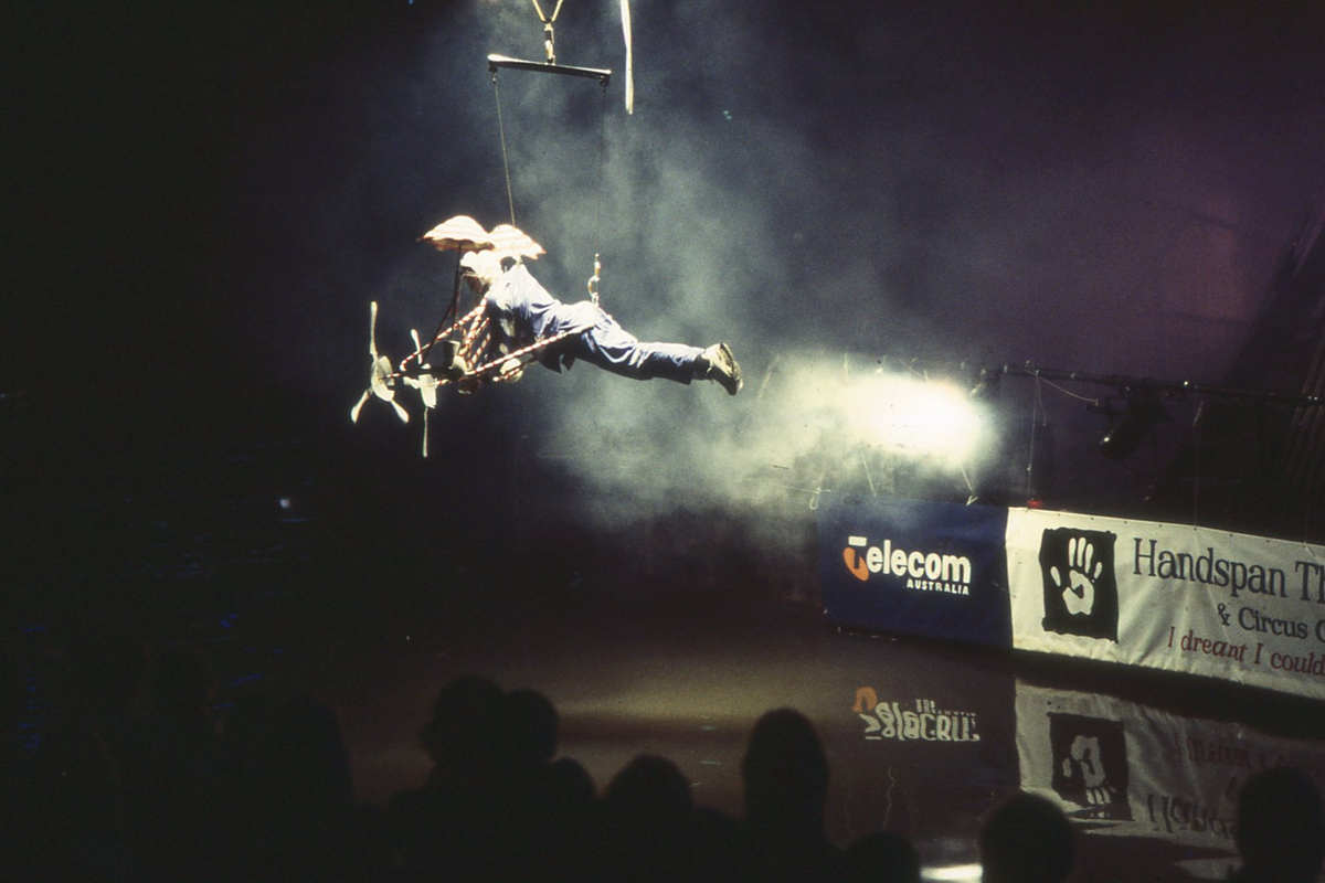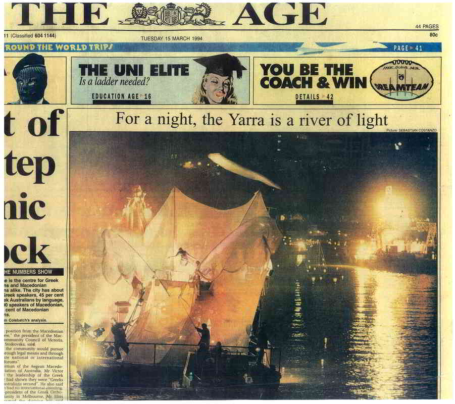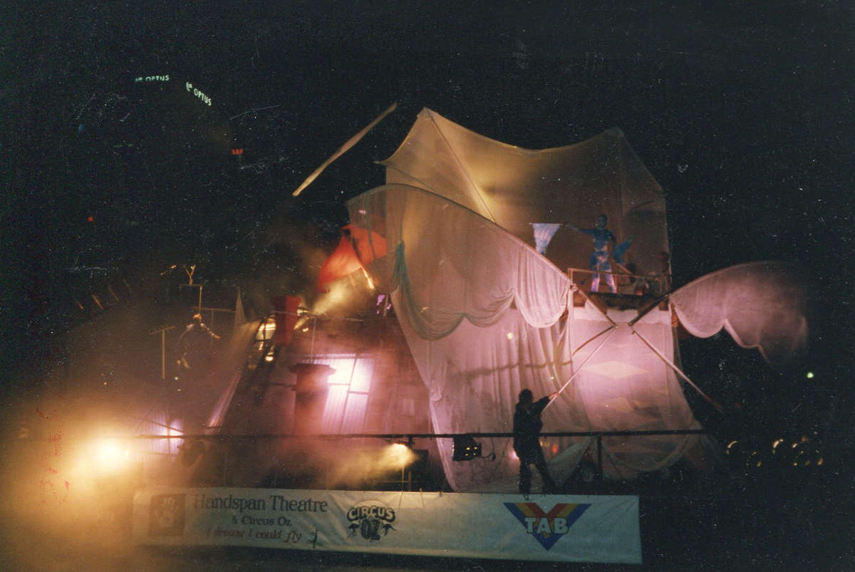 I DREAMT I COULD FLY was commissioned by the Melbourne Moomba Festival for nightly performances on a barge on the Yarra River during the 1994 Moomba Festival long weekend. Moomba approached Handspan about the project in 1993 and suggested the theme of flying.