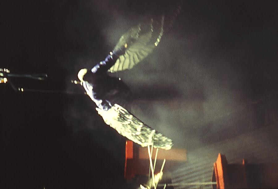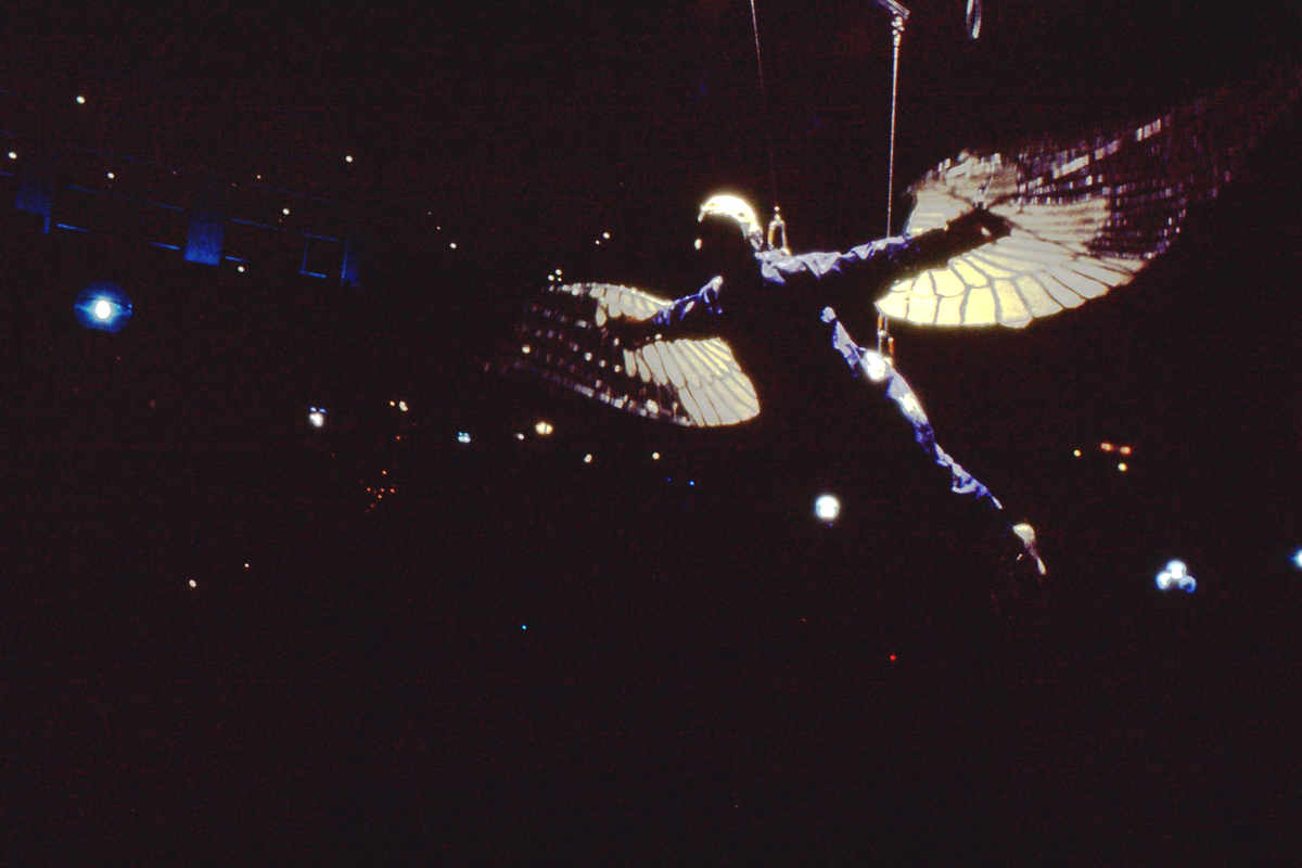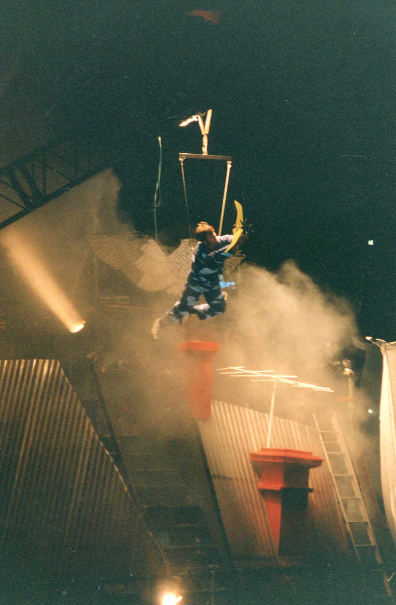 The work combined aerial artistry with large scale imagery. Using fulcrums and scissor lifts and illuminated by spectacular lighting, its central character, The Dreamer, rose and fell and revolved with her bed, as her dreams pushed towards. The Flier, inspired by birds soaring above, tried mechanical techniques to get airborne. His attempts parodied early flying experiments of the Wright Brothers until he succeeded. He appeared, suspended from an overhead crane, to launch himself from the rooftops that topped the barge setting. Flying high he became Icarus and his wings burst into flame, adding magic to the tricks of circus and animated imagery that made the production.