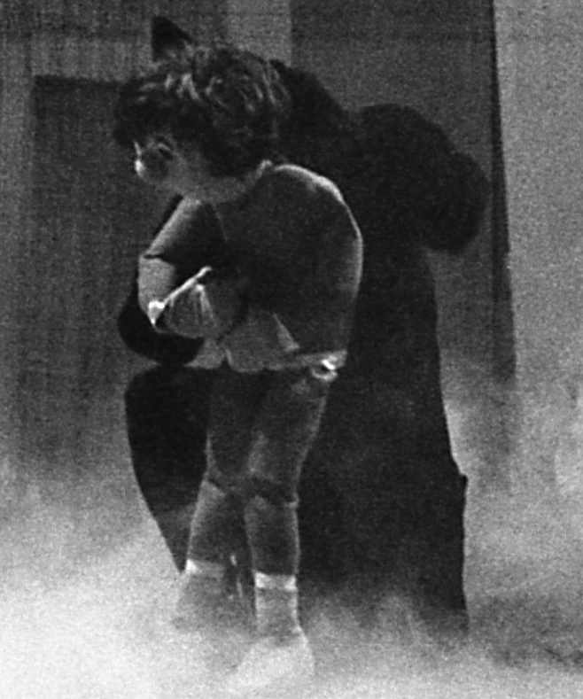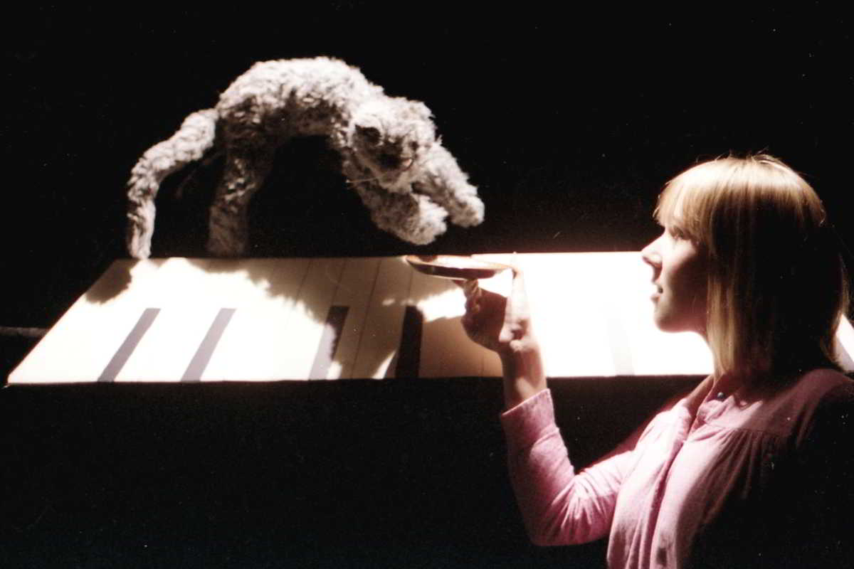 the hall door dissolves to reveal a black theatre image of Jandy's father - two hands playing phantom keyboards in the darkness; later the same dissolve reveals the face of a tiger. a larger-than-life silouette with light shining through the eyes and snarling mouth; in the final scene, Jandy walks down the dark hallway - simple bare stage with cut-out pieces of furniture floating into place - there is a feeling of danger, but also a wonderful sense of space and release.