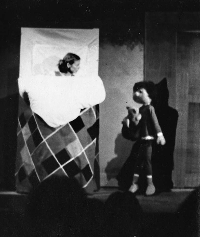 Peter Wilson manipulates Jandy's brother Peter, a child life-size puppet, in black hood and costume. The introduction of the technique of the puppeteer moving about the stage sitting on a small, silent trolley has proved very successful in increasing his mobility while diminishing visual distraction from the puppet.