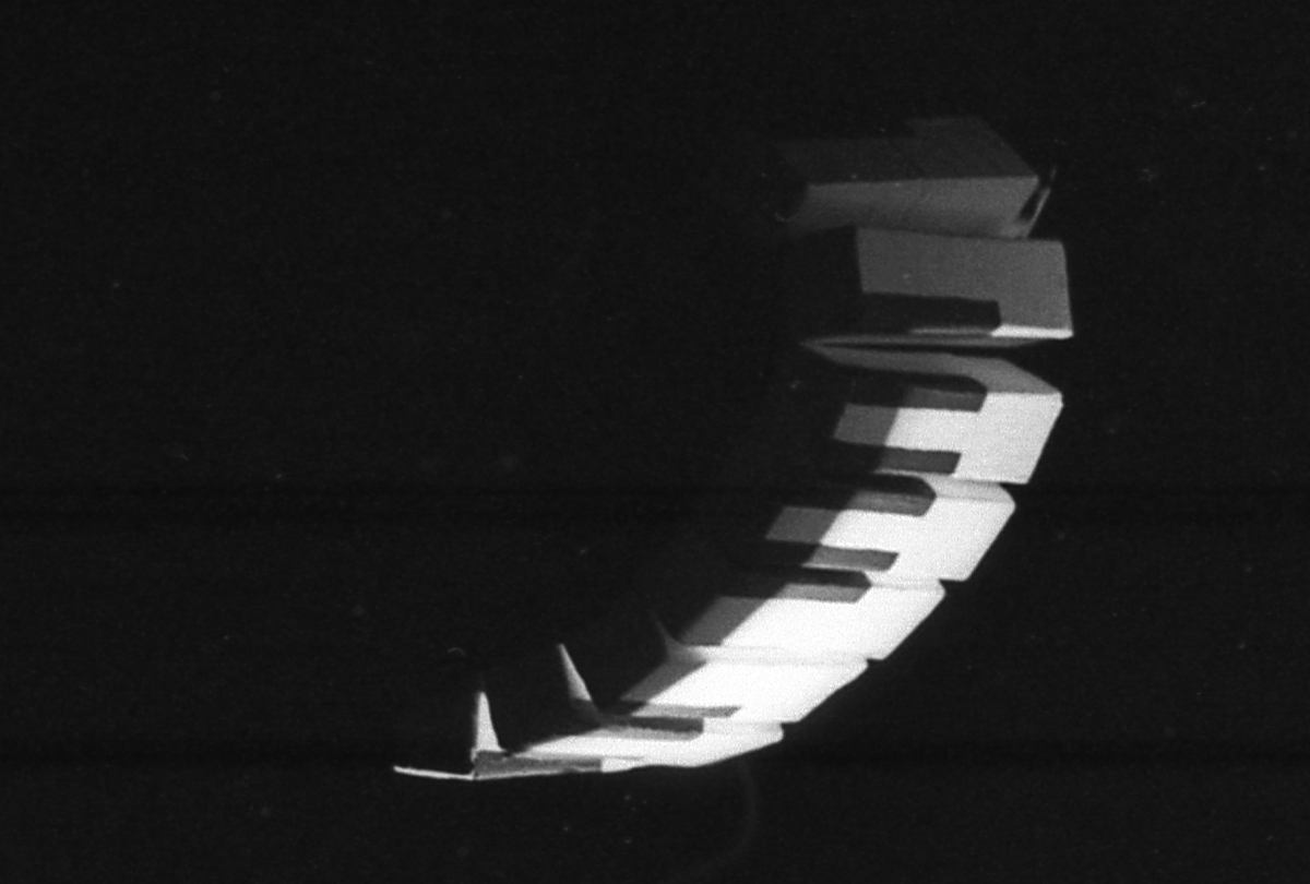 Jandy Malone and the Nine O'Clock Tiger, Handspan Theatre a curve of flying piano key against a black background