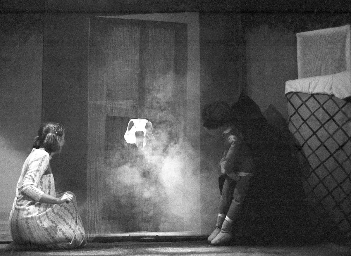 Ken Evans’ design of a black and white toned bedroom was a simple scene of two upright beds (full-sized versions of the booth model used in Hansel and Gretel), flanking a scrim door through which the tiger glowed when summoned, and behind which the objects in the hallway appeared in a black theatre curtained void.