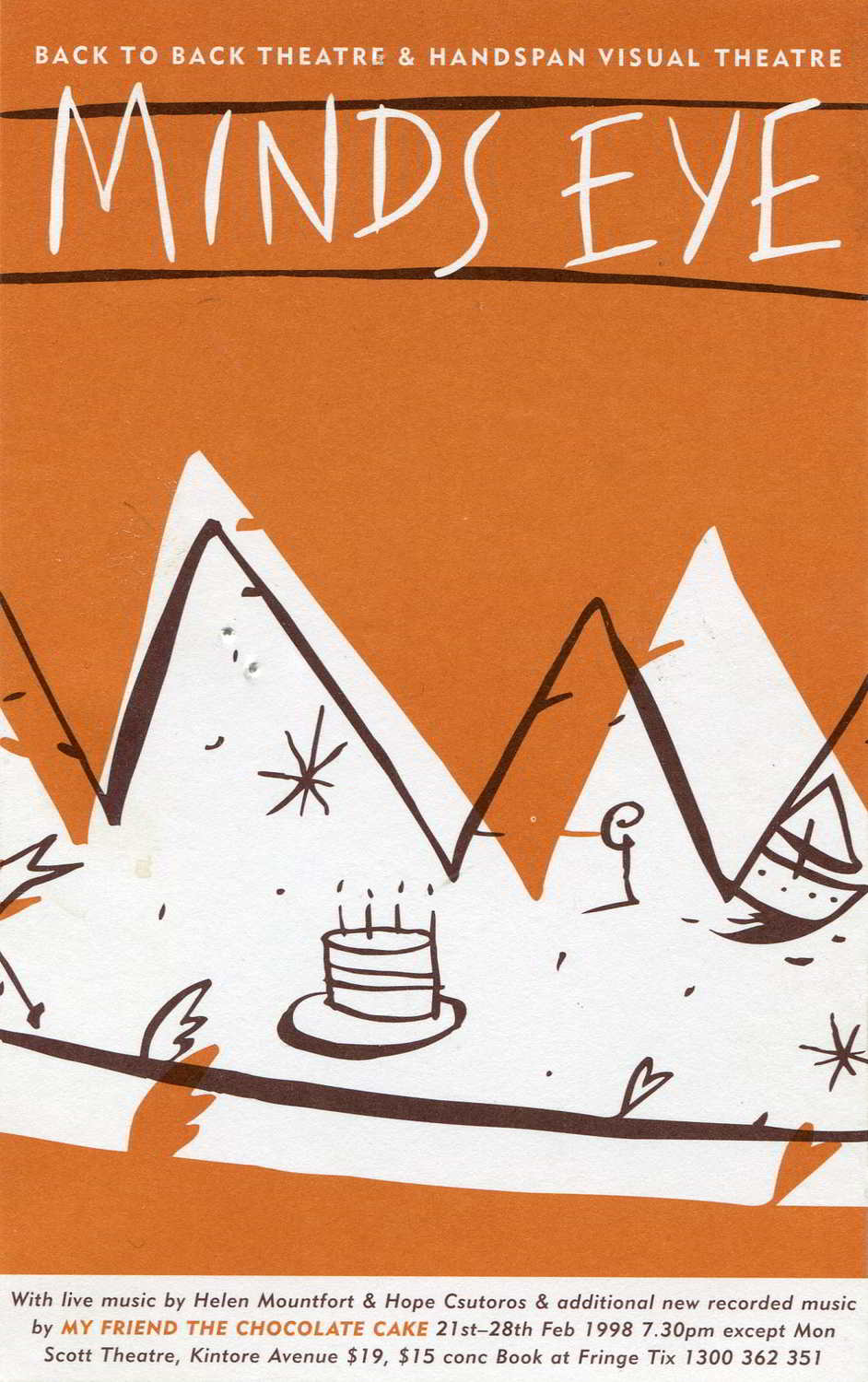 MINDS EYE was revived for a season at the 1998 Adelaide Fringe Festival where the co-production credits billed Back-to-Back with under the newly branded Handspan Visual Theatre.