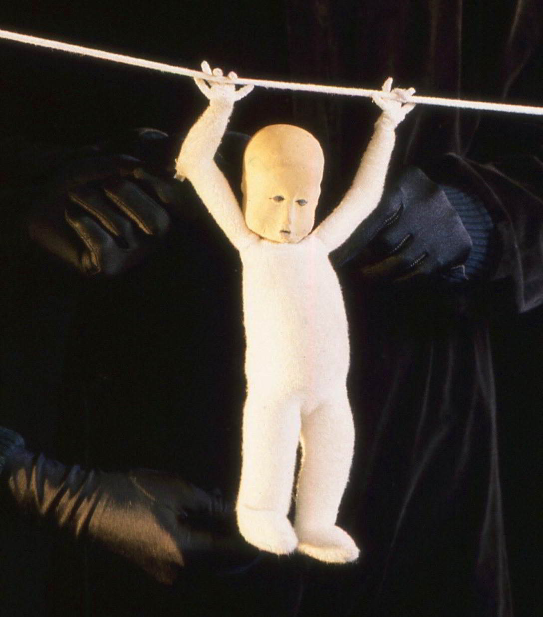 In this work, Michele created puppet figures, much scaled down from the original baby character, but retaining its featureless all white body to illustrate universal emotions experienced in progressively aging bodies.
