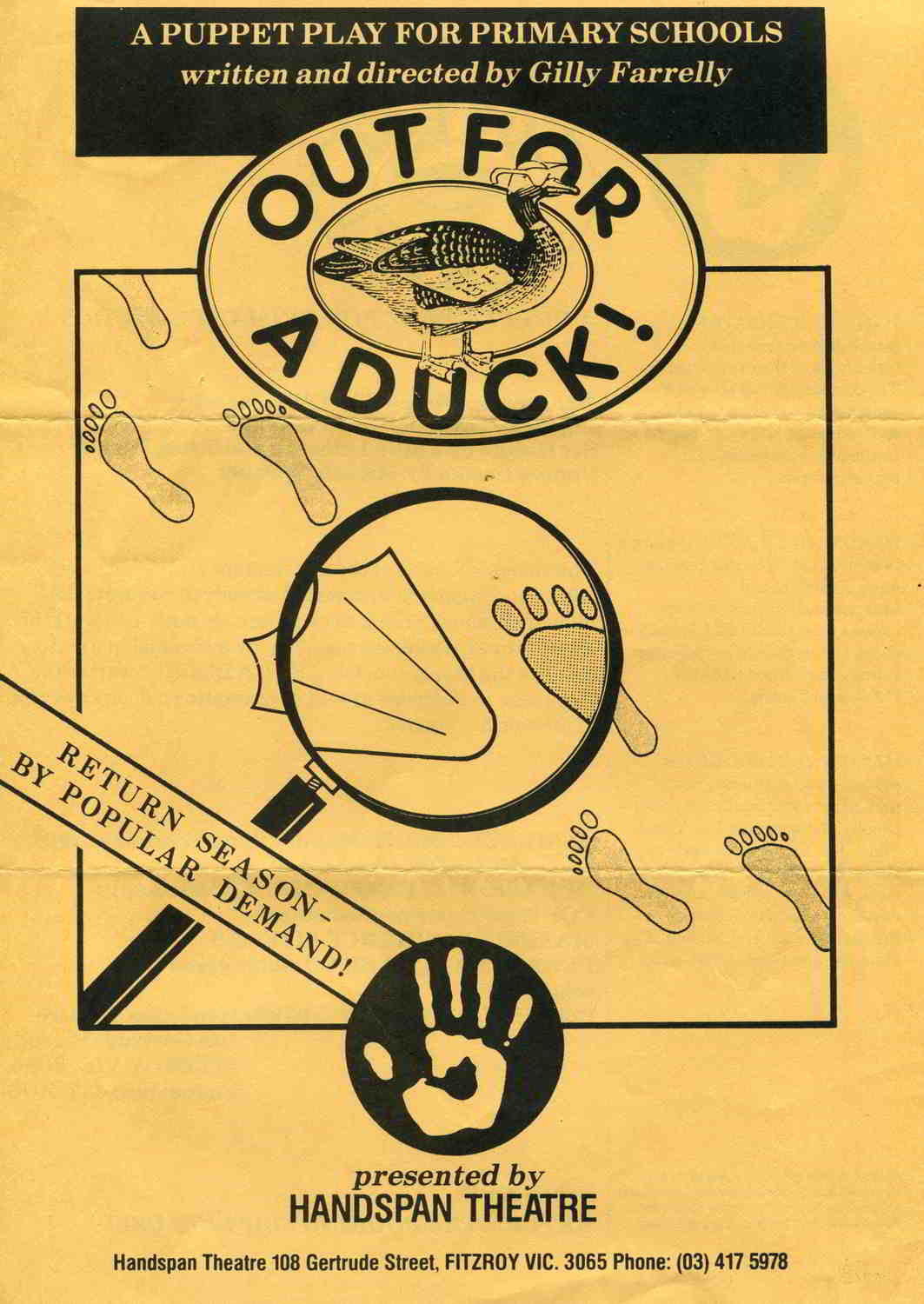 OUT FOR A DUCK began because longtime Handspan member, Avril McQueen could speak duck! This finely-honed party-trick sparked the comic script which was devised to show upper primary school age audiences that it's OK, if sometimes awkward, to be different. Owing homage to Anderson's Ugly Duckling story, the play centres around Daphne A. Duck, originally played by Avril, who arrested for 'being a duck in a public place'2 recounts the trials she has encountered in trying to fit in to the world around her.