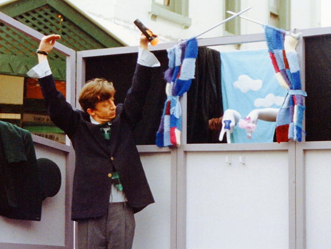 OUT FOR A DUCK was staged in a tram stop set in and around which actors and puppets performed the action. Its simple structure transformed into schoolroom, stadium, theatre and TV studio and provided hiding places for Daphne as she was chased from sideshow alley's duck shooting range to a restaurant serving 'duck l'orange'.