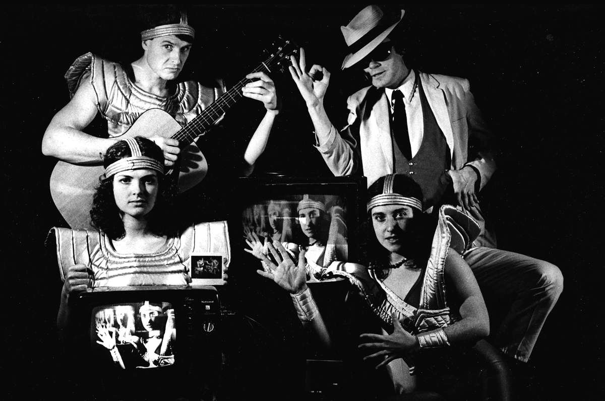 The performance style of PRIME TIME was more actor-focused than previous Handspan works, its key imagery was in striking futuristic costumes, and its message conveyed through comic mime and song interspersed with live dialogue and banter between the actor/characters and Technocrat Cat (TC). The adolescent heroine enticed into the world of television by TC with promises of fame and fortune, was manipulated by a money hungry media-controller until she rebelled and was thrown out.