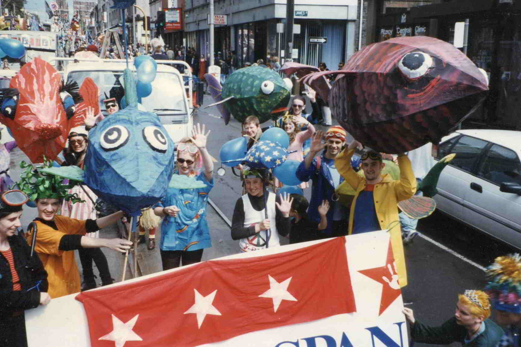 SWIM continued Handspan's tradition of participation in the Melbourne Fringe Festival Parade and built on the success of Handspan's 1995 award winning parade entry Enrapture.