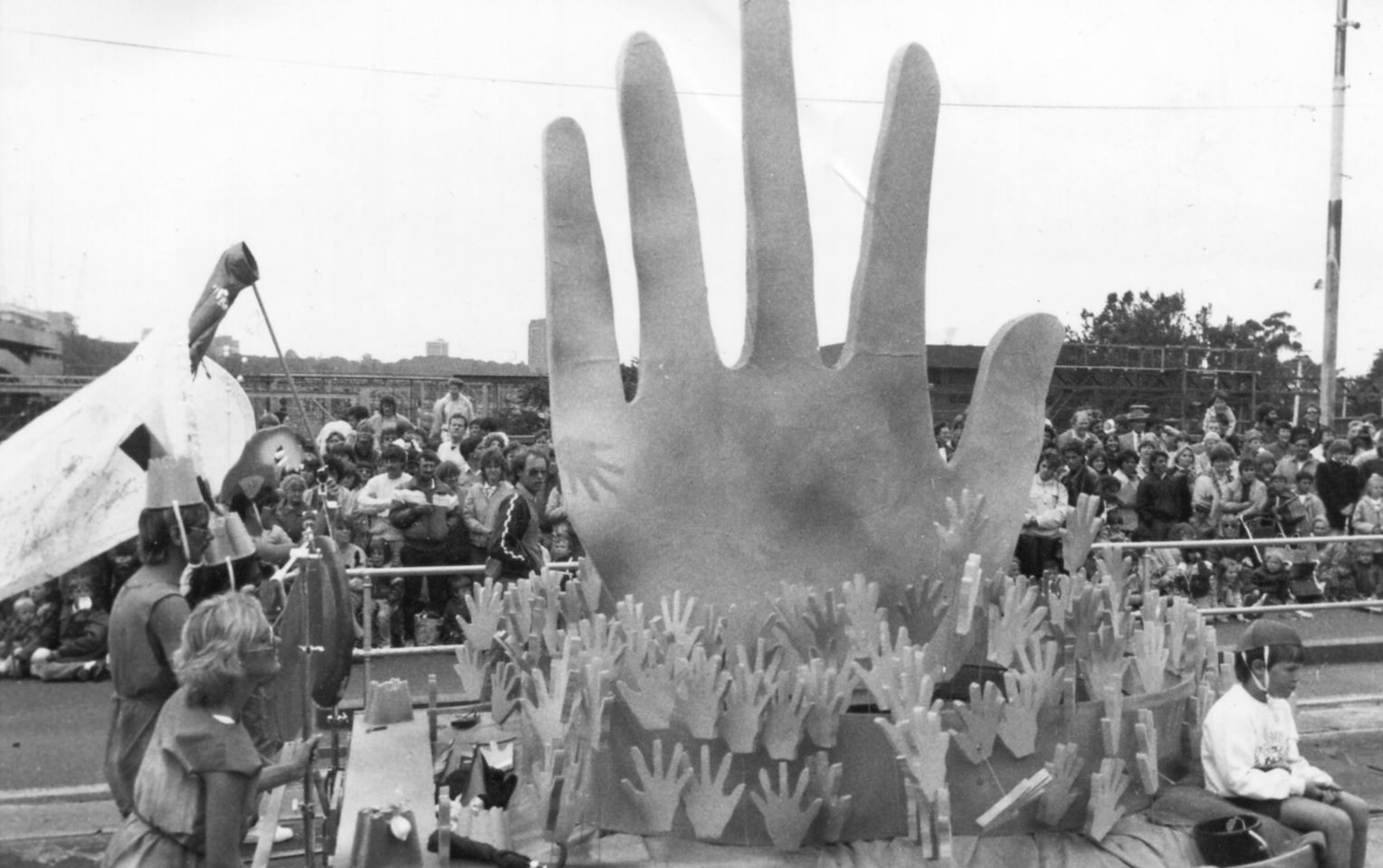 The Festival theme for 1987 was Moomba Goes to the Movies. Parade entries were required to be based on a film title, and Handspan chose Peter Weir's film, The Last Wave.
