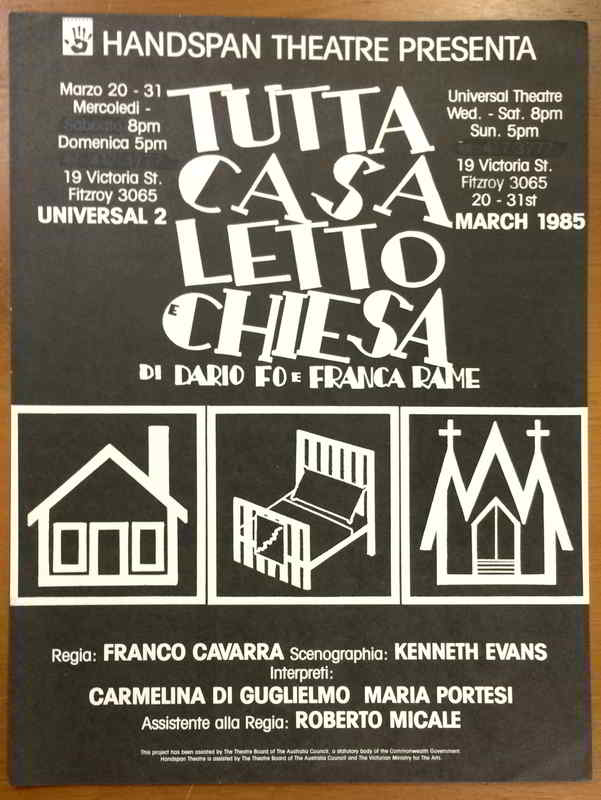 Carmelina Di Guglielmo initially produced the piece for a short season at the Universal Theatre in October,1984. She had been inspired to explore her own cultural heritage after touring to Spoleto in Italy with Handspan's production, Secrets (1983), and subsequently travelling through the country to meet distant relatives. She was keen to celebrate this heritage in her work and her production of TUTTA CASA LETTO E CHIESA, (in literal English, "All Home, Bed and Church") was her first project.